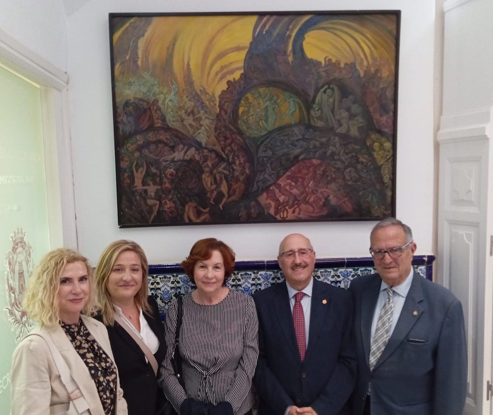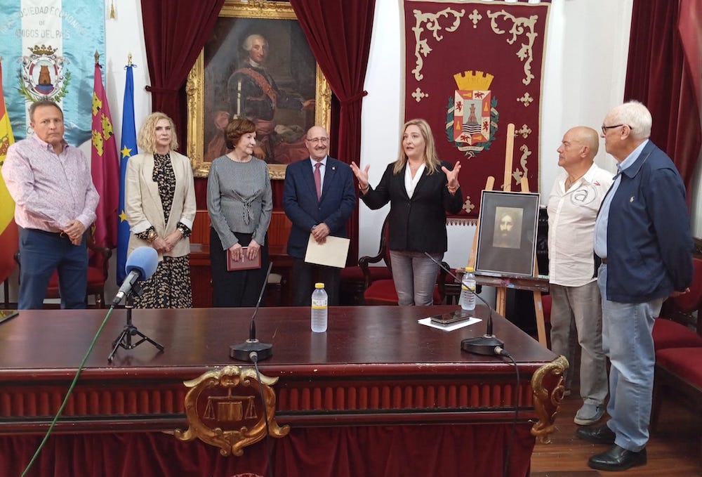 Los herederos del pintor cartagenero han comenzado la donación gratuita y perpetua a la ciudad de una serie de cuadros del artista. El acto se ha celebrado en la Real Sociedad Económica de Amigos del País, entidad que albergará las obras. El acto contó con la presencia de Silvia Lezcano, hija de la ahijada de Vicente Ros y propietaria de los bienes del pintor, a quien se observa en el centro de la imagen, junto al presidente de la sociedad casi bicentenaria, Pedro Negroles, quien porta el documento acreditación de la cesión de las obras.