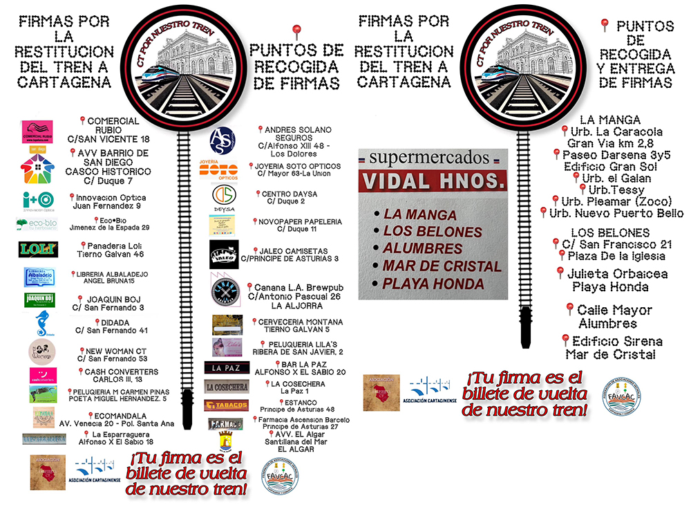 La Federación de Asociaciones de Cartagena y Comarca, la asociación ‘Cartagena despierta’ y la Asociación Cartaginense están llevando una campaña de recogida de rúbricas presenciales para exigir el restablecimiento de la línea ferroviaria entre la ciudad portuaria y la capital de España, que estuvo funcionando desde 1862 hasta hace unos meses y que, consideran, está dañando económicamente a esta zona del sureste español.