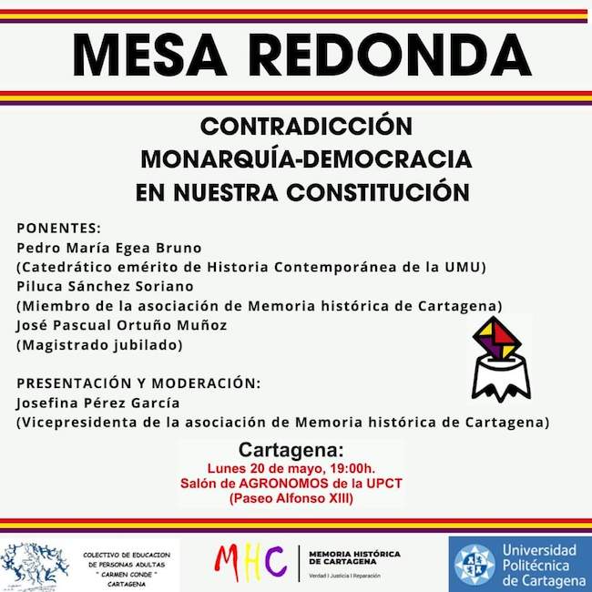 La asociación de Cartagena organiza la charla-coloquio ‘Contradicción monarquía-democracia en nuestra Constitución’ con los expertos Pedro Martía Egea, Piluca Sánchez y José Pascual Ortuño. Será hoy, a las 19 horas, en el salón de Agrónomos de la UPCT del paseo de Alfonso XIII.