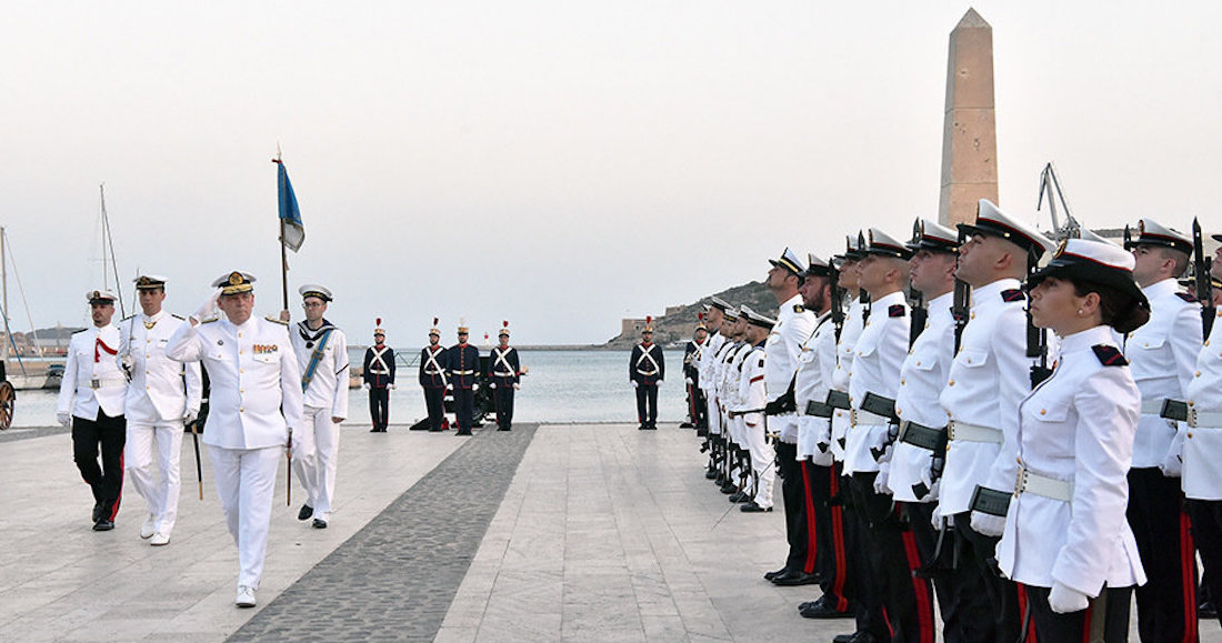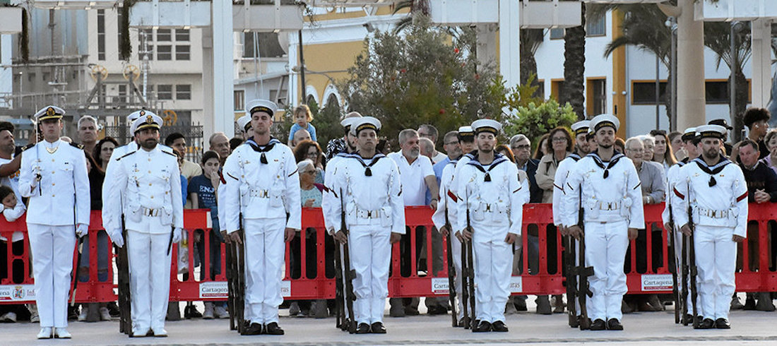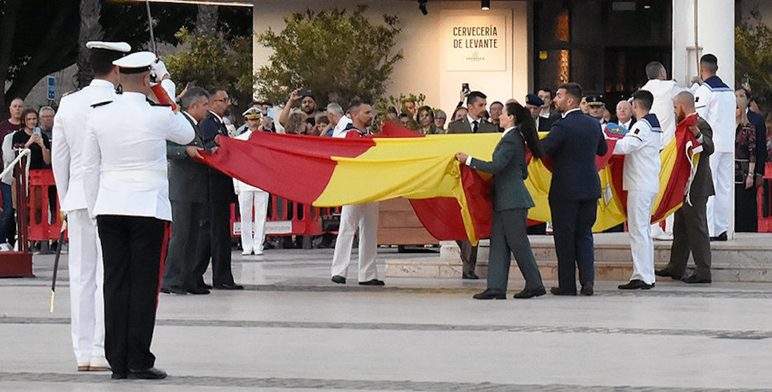 La explanada del puerto (Plaza Mayor) acogió en la tarde-noche de ayer el solemne arriado conjunto de bandera de España con motivo del 'Día de las Fuerzas Armadas 2024'. El acto fue presidido por el Almirante de Acción Marítima, vicealmirante Victoriano Gilabert Agote.
