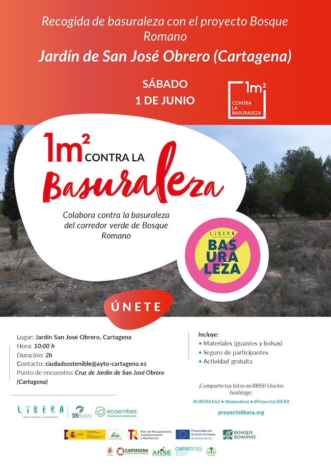 El Ayuntamiento de Cartagena busca voluntarios para participar en la recogida de basuraleza que tiene lugar este sábado, 1 de junio, en el jardín de la barriada de San José Obrero.