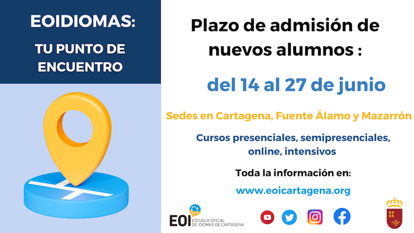 Del 14 al 27 de junio se podrá realizar la solicitud de plaza de manera telemática a través de nuestra página web: www.eoicartagena.org, donde se puede encontrar toda la información pertinente.