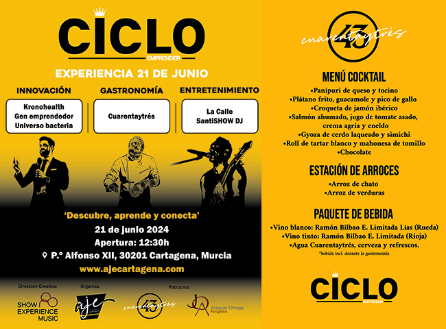 La Asociación de Jóvenes Empresarios de Cartagena y Comarca (AJE Cartagena) se complace en anunciar Ciclo Emprender, una experiencia única que tendrá lugar el próximo 21 de junio en el emblemático Espacio Cuarentaytrés en Cartagena, Murcia. Este evento, patrocinado por Espacio Cuarentaytrés, Joaquín Ortega Abogados y Talasur Group, promete ser una jornada inolvidable donde la innovación, la gastronomía y el entretenimiento se fusionan para crear un entorno inspirador y dinámico.
