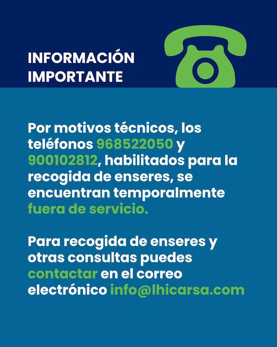 La empresa concesionaria de la limpieza en el municipio de Cartagena comunica que, por motivos técnicos, se encuentran temporalmente fuera de servicio los teléfonos habilitados para la recogida de enseres: 968 522 050 y 900 102 812. Mientras dura esta situación, para la recogida de enseres y otras consultas hay que contactar con el correo electrónico; Esta dirección de correo electrónico está siendo protegida contra los robots de spam. Necesita tener JavaScript habilitado para poder verlo.