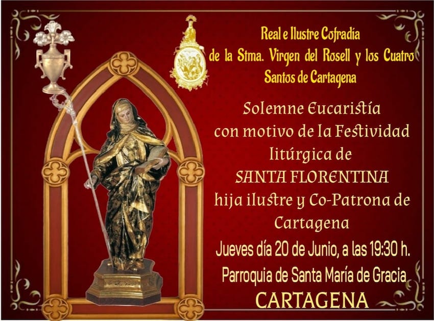 La Real e Ilustre Cofradía de la Virgen del Rosell y de los Cuatro Santos de Cartagena informa que este jueves se celebrará una solemne eucaristía en la iglesia de Santa maría (19.30 horas) con motivo de la festividad de la hija ilustre y copatrona de Cartagena.