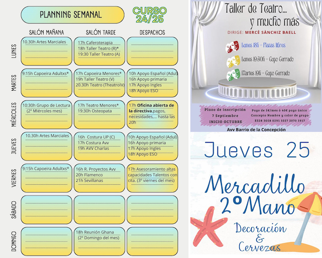 Las actividades programadas por la asociación de vecinos en las que se pueden apuntar los asociados van desde artes marciales hasta bailes de diversos estilos, apoyo en idiomas o ESO, taller de teatro, grupo de lectura, etc. Además, este jueves hay mercadillo de segunda mano. Al margen, ya está expuesto el nuevo Plan General de Ordenación Urbana (PGOU) del municipio, que será analizado mediante mesas de trabajo.