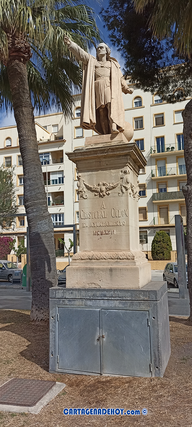 El Gobierno español, por una Real Orden dada en 1882, aprobó erigir a Cristóbal Colón una estatua en el Arsenal Militar. La obra será ejecutada por el artista Juan Sanmartín y Serra, natural de Santiago de Compostela. Se realizó en Génova, con mármol blanco de Carrara, y se transportó hasta Marsella en un vapor francés. Llegó desde el puerto francés hasta aquí en un vapor español. El Ministerio de Marina la cedió al Ayuntamiento de Cartagena, estando depositada en el Arsenal y luego encerrada en la Misericordia, hasta que por fin se ubicó en su actual emplazamiento en el año 1921.