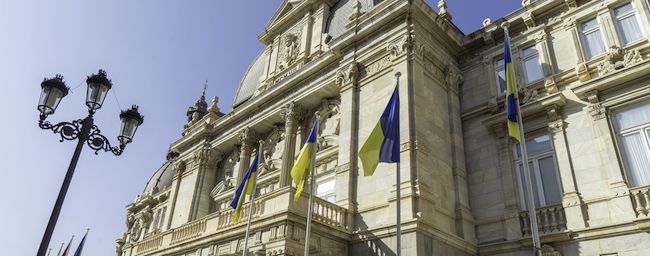La bandera ucraniana ondeará durante este todo el fin de semana en los cuatro mástiles de respeto a las puertas del Palacio Consistorial, como señal de solidaridad del Ayuntamiento de Cartagena coincidiendo con la conmemoración, este sábado 24 de agosto, del Día de la Independencia de Ucrania.