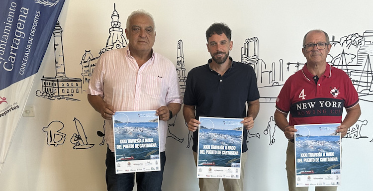 El concejal de Deportes, José Martínez, junto al Director Deportivo del Club Natación Marina Cartagena "Áncora", Francisco Domínguez, y el secretario de la entidad, Ricardo Costa, han presentado este jueves 12 de septiembre la XXXI Travesía a Nado al Puerto de Cartagena, la más emblemática y antigua de la Región de Murcia, que se desarrolla en aguas de la dársena cartagenera.