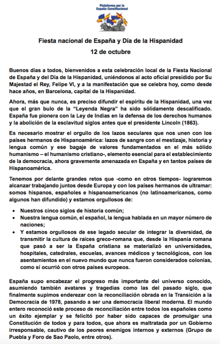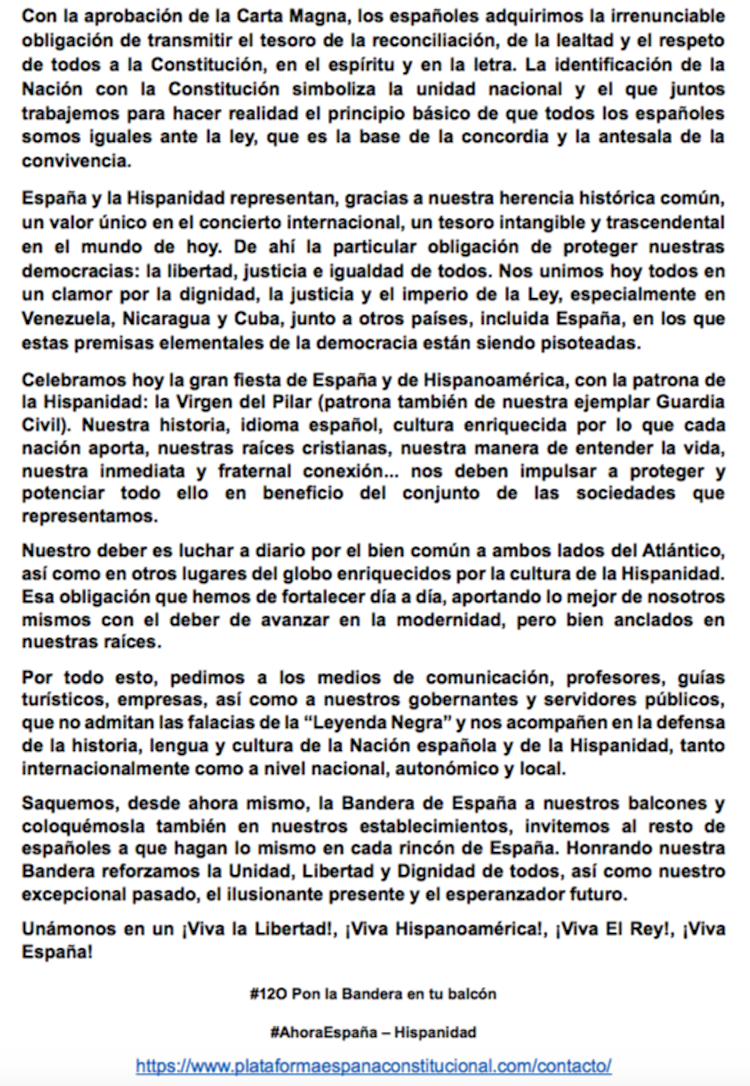 En la misma se dará lectura a un manifiesto en defensa de la Hispanidad que también se expondrá simultáneamente en una treintena de ciudades españolas con motivo de la celebración de la Fiesta Nacional de España y del Día de la Hispanidad.