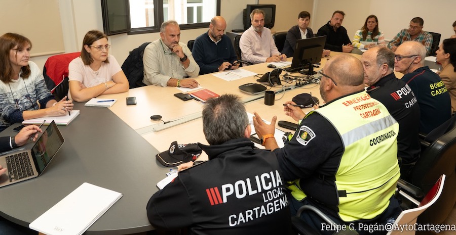 Los concejales de Seguridad Ciudadana y de Infraestructuras, José Ramón Llorca y Diego Ortega, han celebrado este mediodía una reunión de coordinación con los responsables de los diversos servicios municipales para repasar todos los medios y actuaciones que se pondrán en marcha frente al episodio de lluvia y viento que se espera en las próximas horas en el municipio de Cartagena.