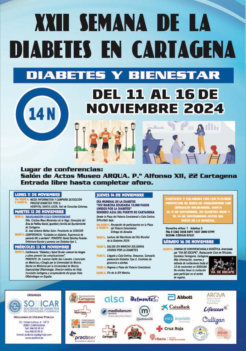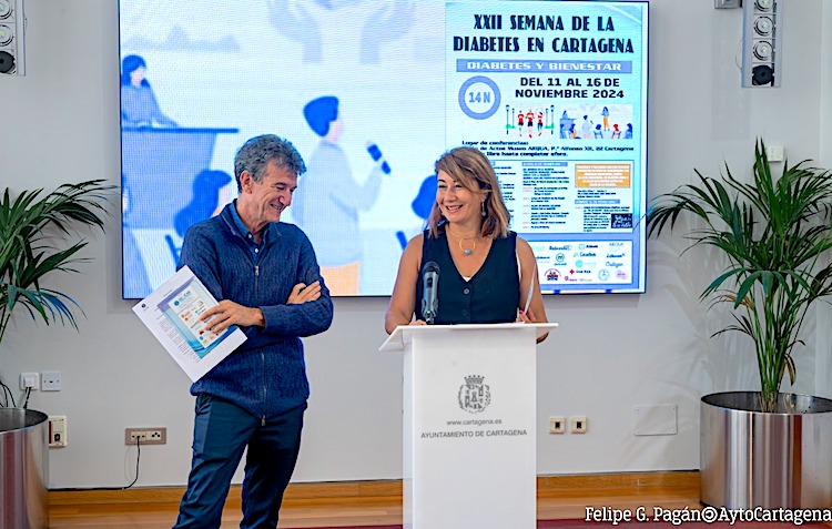 La Asociación de Diabetes de Cartagena y Comarca, SODICAR ha presentado esta mañana la programación de la XXII Semana de la Diabetes en Cartagena, que se llevará a cabo del 11 al 16 de noviembre. Dentro de los actos se incluye una serie de conferencias en el Museo ARQVA y una marcha solidaria que recorrerá el Sendero Azul del Puerto el jueves 14 de noviembre, Día Mundial de la Diabetes.