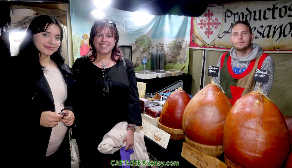 El Mercado Medieval, que ha reducido el número de estand pero que se ha extendido hasta San Diego, está ofreciendo una amplia variedad de productos, siendo los gastronómicos los que más atraen. En la foto, un puesto de embutidos mallorquines con sobrasada en vejigas de vaca.