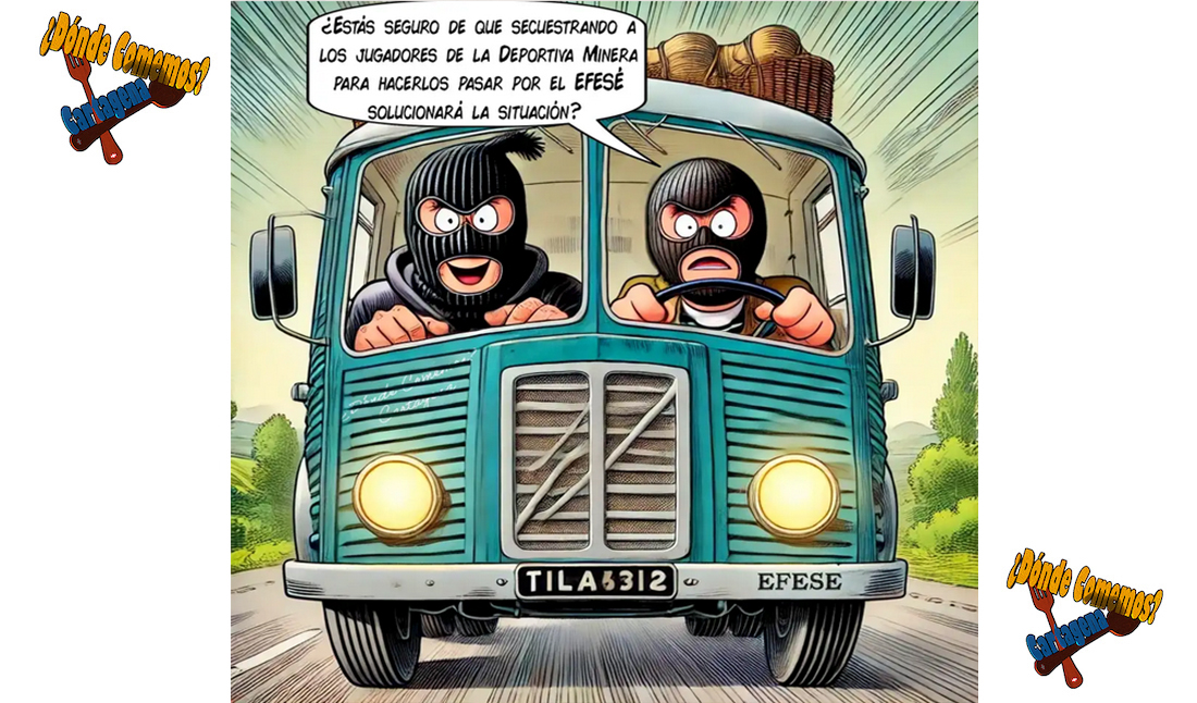 Enrique Costa y Aida Belmonte, del portal '¿Dónde comemos?, Cartagena', ofrecen una nueva y simpática viñeta a los lectores, que en esta ocasión va relacionada con la penosa marcha del FC Cartagena en la segunda división del fútbol profesional y el buenhacer de la Deportiva Minera de El Llano del Beal en la Segunda RFEF y en la Copa del Rey.