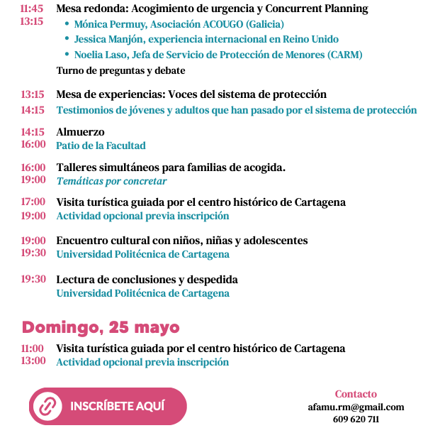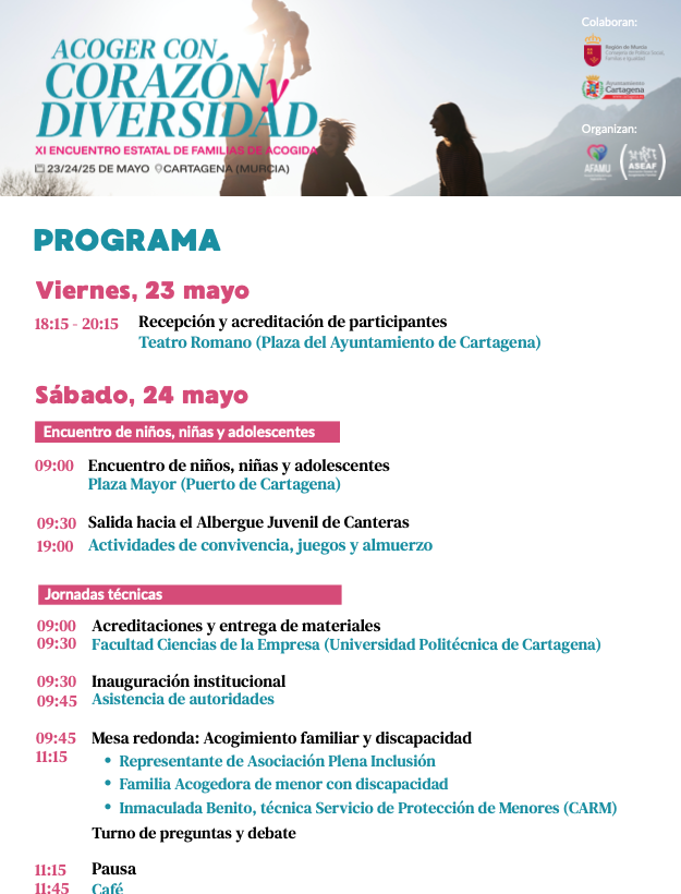 Cartagena alberga un encuentro estatal de familias de acogida del 23 al 25 de mayo. Este evento está organizado por la Asociación de Familias de Acogida de la Región de Murcia (AFAMU) y la Asociación Estatal de Acogimiento Familiar (ASEAF) en colaboración con el Ayuntamiento de Cartagena y la Comunidad Autónoma.