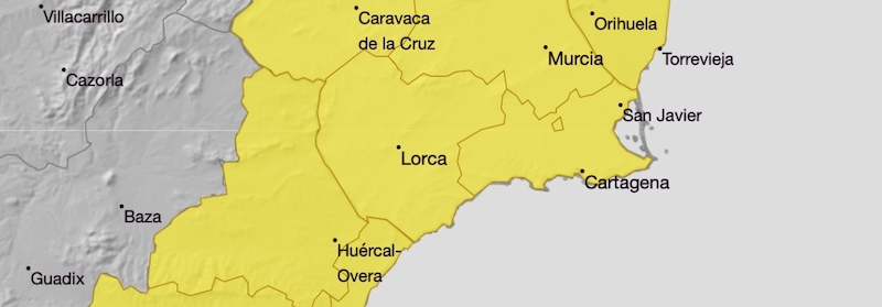 También están en aviso amarillo el resto de la Región, así como las provincias limítrofes de Alicante y Almería.