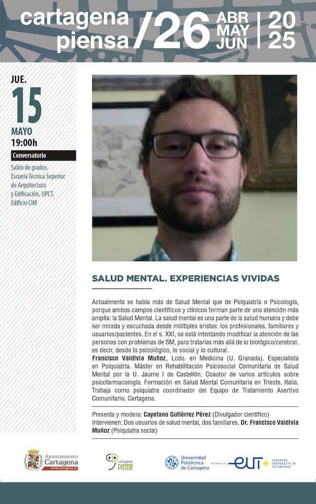 El psiquiatra Francisco Valdivia impartirá esta tarde una charla, que contará con testimonio de usuarios de salud mental, desde la Escuela Técnica Superior de Arquitectura de la UPCT. Entrada gratuita.