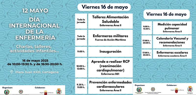 Con motivo de su día internacional, profesionales de este gremio sanitario estarán este viernes en la céntrica plaza de Cartagena con carpas en las que se llevarán a cabo actividades y talleres sobre alimentación saludable, prevención de accidentes cardiovasculares, espirometrías para medir tu capacidad pulmonar, etc.