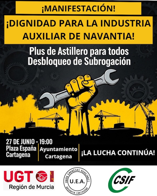 La manifestación saldrá a las 19 horas de este viernes desde la plaza de España y culminará en la plaza del Ayuntamiento, estando convocada por UGT, Unión de Empresas Auxiliares Navantia Cartagena (UEA) y CSIF.