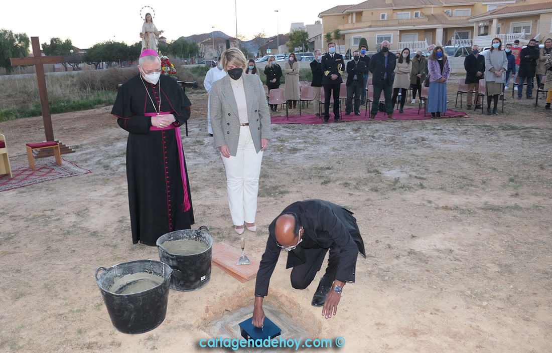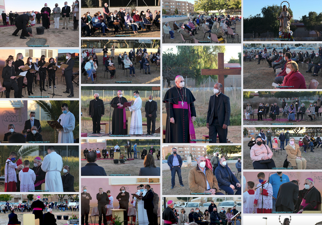 Los terrenos anexos a la actual iglesia de María Reina de los Corazones ha acogido esta tarde el inicio de la recta final hacia la construcción de un nuevo y brillante hogar para una parroquia que surgió en 1998 en un salón de la Entidad de Conservación del Polígono Santa Ana y que estrenó iglesia en el año 2000 dentro del núcleo de población que más ha crecido en Cartagena en el siglo XXI, con un importante porcentaje de jóvenes entre sus vecinos. Ahora llega acometer un gran paso en esa progresión.