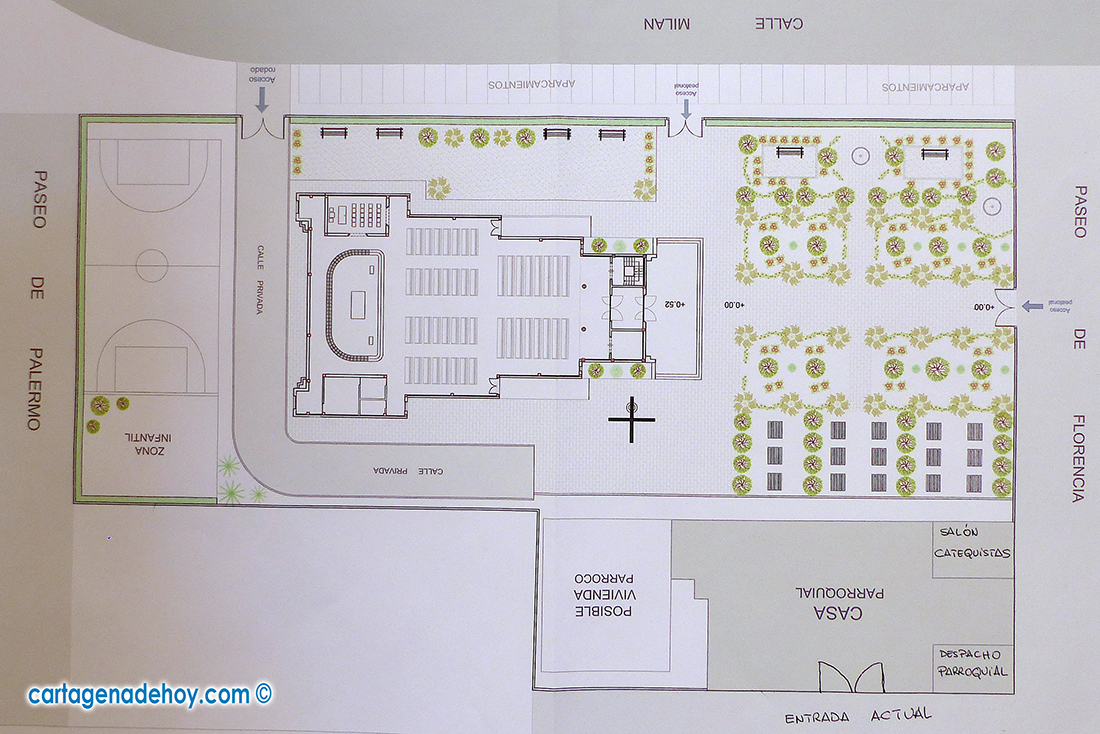 La futura iglesia tendrá capacidad para acoger a 350 personas sentadas, más o menos el aforo de Santa María, el templo de donde salen las procesiones de Semana Santa en Cartagena. Este dato ya da idea de su tamaño, en el que se cuida tanto continente como contenido. “Para su diseño tiene la ventaja de no tener otro inmueble anexo y a partir de ahí es donde surgieron las ideas que se trasladaron al arquitecto. Una parroquia tiene que tener el sello de su comunidad parroquial”, indica Cleto, apuntando que se pretende que sea "una catequesis con una vía sacra. Será un diseño único en España”.