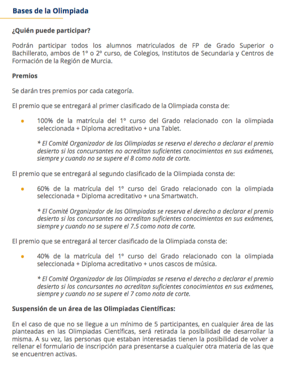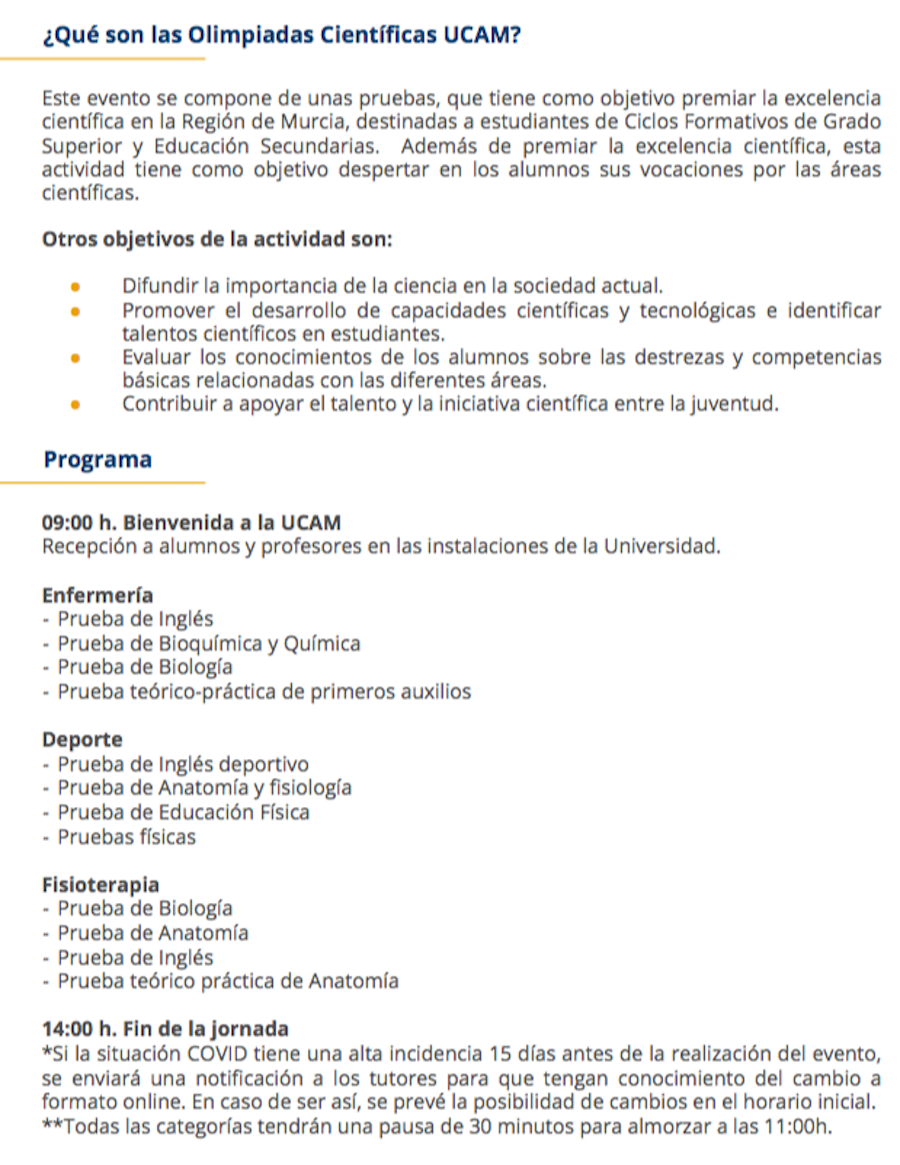 Este evento va dirigido a alumnos de último curso de FP Grado Superior y de primero y segundo de Bachillerato de los centros educativos de la Comarca del Campo de Cartagena, que podrán ganar un descuento del cien, sesenta o cuarenta por ciento del coste de la matrícula en la UCAM del primer curso de las titulaciones de Enfermería, Fisioterapia o Ciencias de la Actividad Física y el Deporte si quedan situados entre los tres primeros puestos de cada categoría, y siempre que logren una calificación de 8 (primer premio), 7´5 (segundo premio) y 7 (tercer premio).