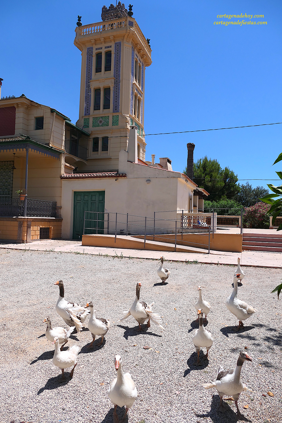 Simpática escena de un grupo de estas aves paseando por el modernista y magnífico entorno de la Torre Llagostera de Los Dolores-San Cristóbal.