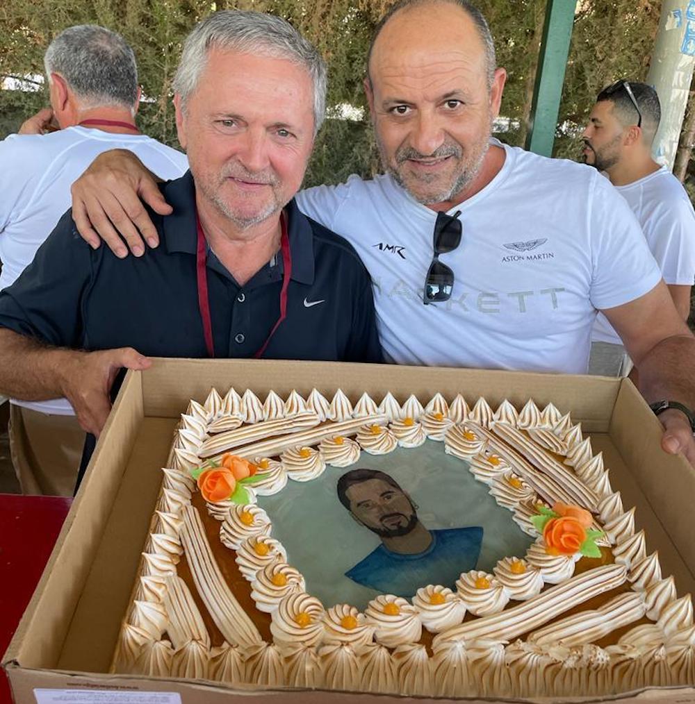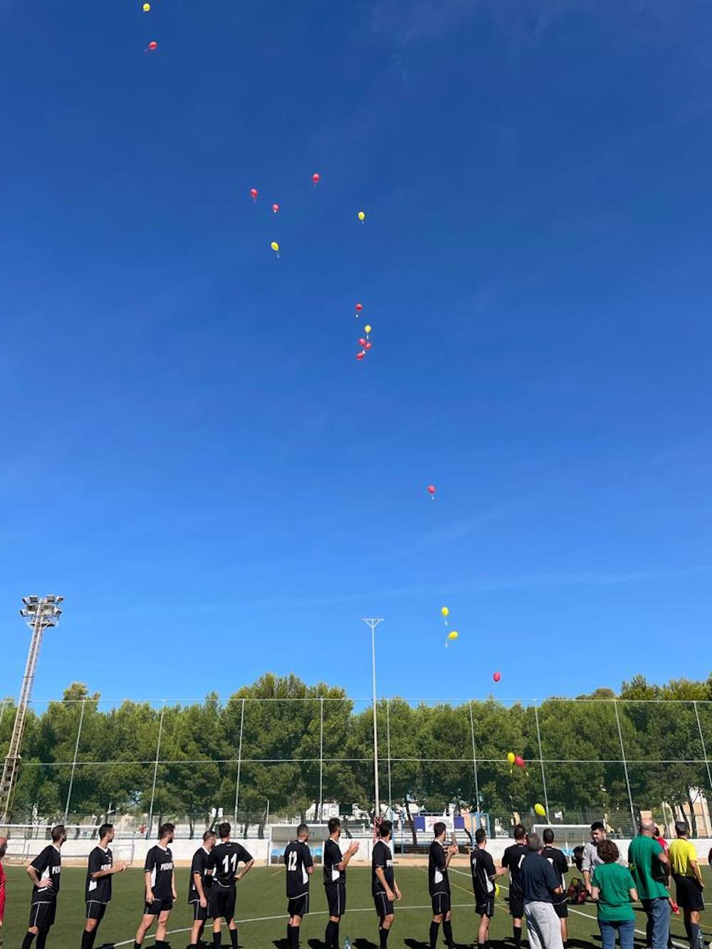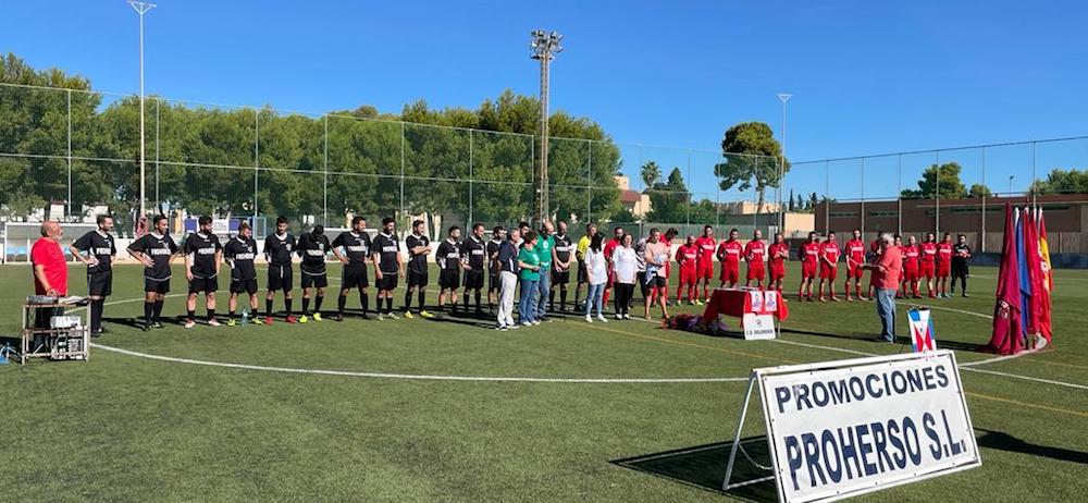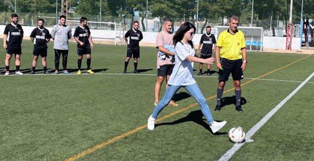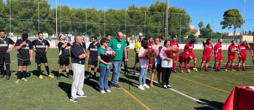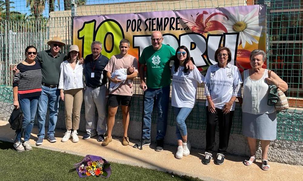 La familia y los amigos del joven fallecido en 2021 volvieron a reunirse para disfrutar de una jornada de fútbol y convivencia, cumpliendo el deseo del dolorense que falleció con 29 años de edad a causa de la ELA. En la imagen, sus padres con el presidente del CD Dolorense, José Rico.