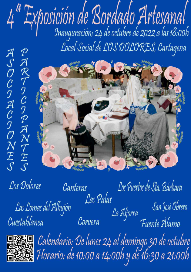 La cuarta exposición de bordado artesanal se inaugura el próximo lunes (18 horas) en el local social dolorense, donde permanecerá hasta el domingo 30 de octubre con la participación de colectivos cartageneros de Canteras, Los Puertos de Santa Bárbara, Las Lomas del Albujón, San José Obrero, La Aljorra, Cuesta Blanca y Los Dolores junto a tres de otros municipios: Las Palas, Fuente Álamo y Corvera.