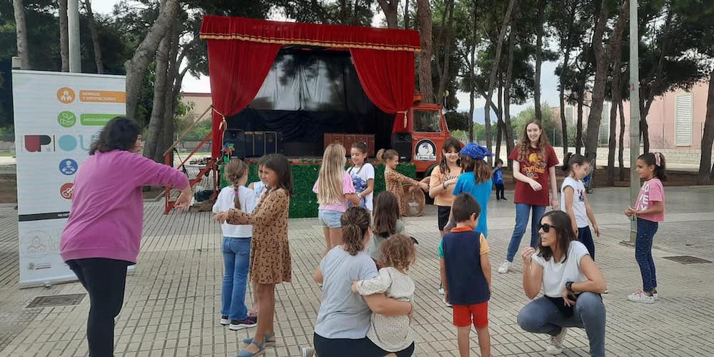 La Universidad Popular de Cartagena estuvo con su activa camioneta-escenario en el Polígono de Santa Ana llevando a cabo u taller teatral con los chavales de la barriada.