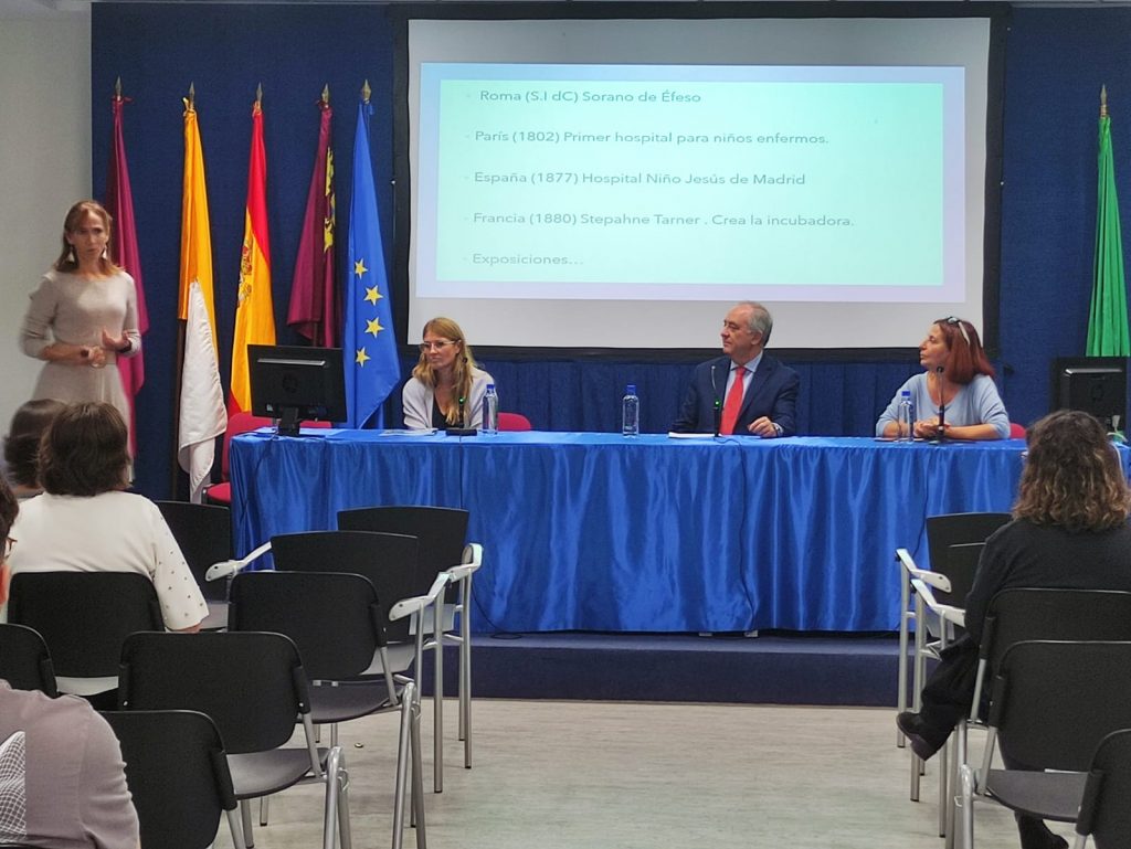 Asimismo, las enfermeras Cristina Gómez Fernández y Nuria Cayuela López, y la técnico en cuidados auxiliares de enfermería Ana María Nieto Navarro, han explicado el desarrollo del proyecto “Pequeñas Caricias” que se lleva a cabo en la Unidad de Neonatología del Hospital Santa Lucía de Cartagena. Han explicado el origen de esta iniciativa y han emocionado detallando el trabajo que se realiza y el objetivo de este proyecto de humanización en el que los hermanos menores de 12 años pueden visitar a los recién nacidos prematuros o enfermos dentro de la unidad de neonatología, con lo que se pretende un refuerzo del vínculo familiar muy importante para todos estos padres que se ven obligados a estar lejos de sus hijos más mayores.