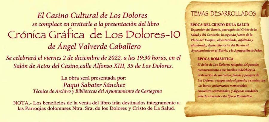 El cronista oficial del barrio presenta este viernes, a las 19.30 horas, en el salón de actos del Casino de la dolorense calle de Alfonso XIII, el décimo tomo de la colección de obras sobre la historia de este enclave de Cartagena Norte, estando centrado en esta ocasión en las que ha denominado épocas del Cristo de la Salud y romántica. El libro será presentado por Paqui Sabater y los beneficios de la venta serán destinados a las dos parroquias del barrio.