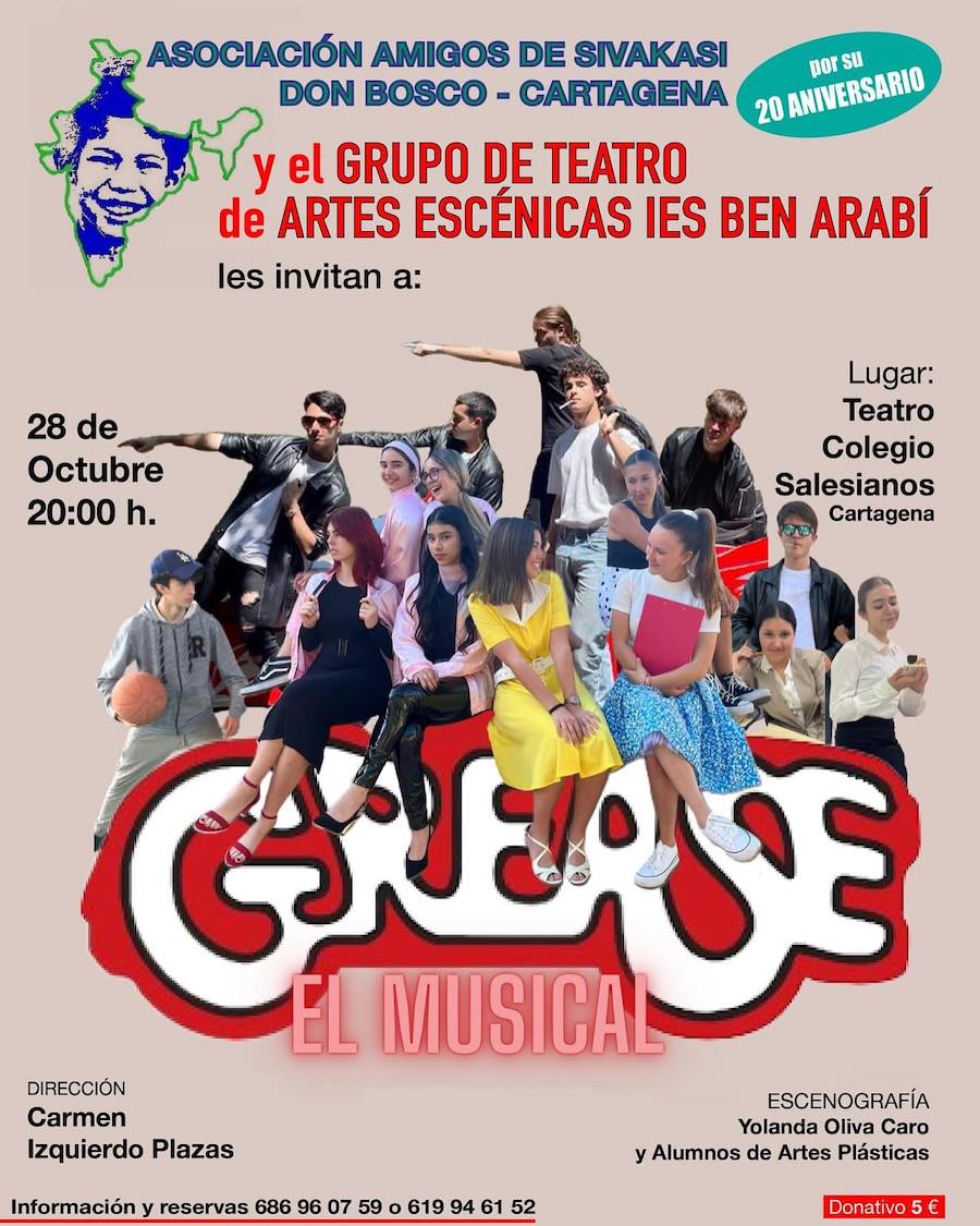El próximo sábado, 28 de octubre, a partir de las 20 horas, se representa el musical 'Grease' en el teatro del colegio Salesianos de Los Dolores-Barriada de Hispanoamérica, a cargo del grupo de artes escénicas del instituto Ben Arabí. Organiza un grupo de amigos que ayuda a los niños del pueblo de la India del que toman en nombre. Aunque cumplen dos décadas en esa labor, todavía hay vecinos de Cartagena que no los conoce.