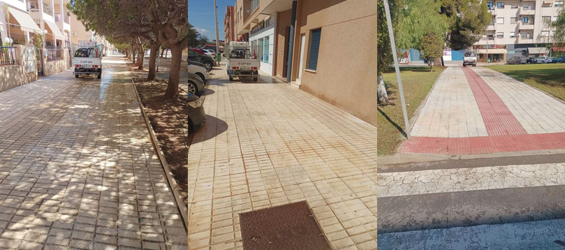 El servicio de mantenimiento y limpieza de la Entidad de Conservación de la barriada de Cartagena norte está llevando a cabo en las últimas semanas, como se viene haciendo regularmente, tareas de baldeo y limpieza más intensiva de las aceras.