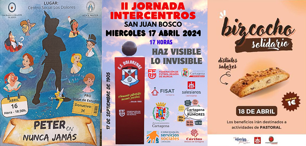 El local social acoge esta tarde la representación de 'Peter en Nunca Jamás', mientras que mañana tiene lugar en el campo San Juan Bosco el segundo campeonato intercentros de los barrios de Cartagena Norte. El jueves, además, se desarrolla en Salesianos el 'Bizcocho solidario de Pascua'. También indicar que la charla sobre moda modernista que iba a tener lugar este jueves en el local social dolorense se aplaza hasta nueva fecha.