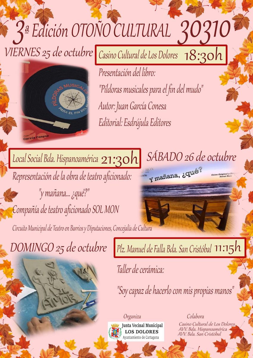 También destaca la variedad de escenarios, como el Casino de Los Dolores, los locales sociales y las plazas de las diferentes barriadas, la plaza Virgen de los Dolores, el colegio Salesianos y los jardines de Castillitos. 'Otoño cultural' surge a través de la Junta Vecinal Municipal de Los Dolores con la colaboración de las asociaciones de las tres barriadas mencionadas.