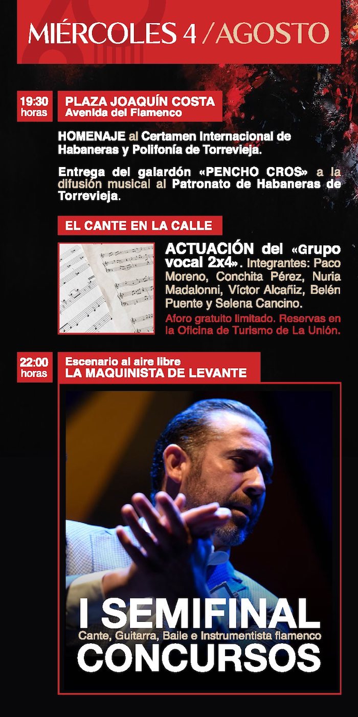 Hoy miércoles, 4 de agosto, la Plaza Joaquín Costa acogerá a las 19:30 horas el homenaje al Certamen Internacional de Habaneras y Polifonía de Torrevieja, con la actuación del Grupo Vocal 2x4, integrado por Paco Moreno, Conchita Pérez, Nuria Madalonni, Víctor Alcañiz, Belén Puente y Selena Cancino.