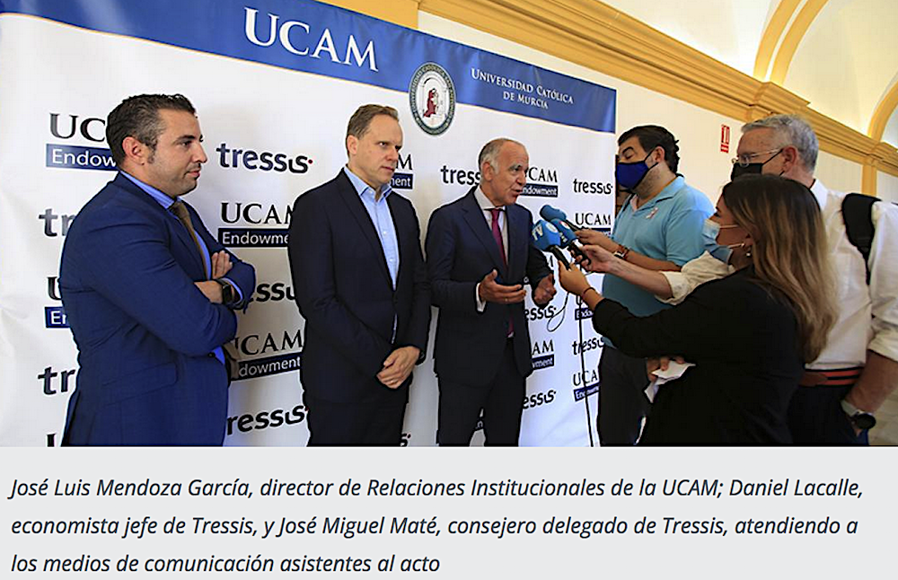 José Miguel Maté, consejero delegado de Tressis, entidad que gestiona este fondo, ha destacado que “Hoy es un día especial para Tressis ya que presentamos oficialmente el lanzamiento del endowment de la UCAM fruto de nuestra alianza. Nuestra misión es ayudar a nuestros clientes a alcanzar sus objetivos vitales, por lo que asesorar la cartera del endowment, que tiene unos objetivos muy claros, está perfectamente alineado con nuestra forma de entender la planificación financiera y la gestión de patrimonios. Además, el horizonte a largo plazo, nos permite incluir las tendendencias en las que tenemos convicción: demografía, tecnología y sostenibilidad, integrando criterios de inversión socialmente responsable en la composición de la cartera desde el inicio de la misma.