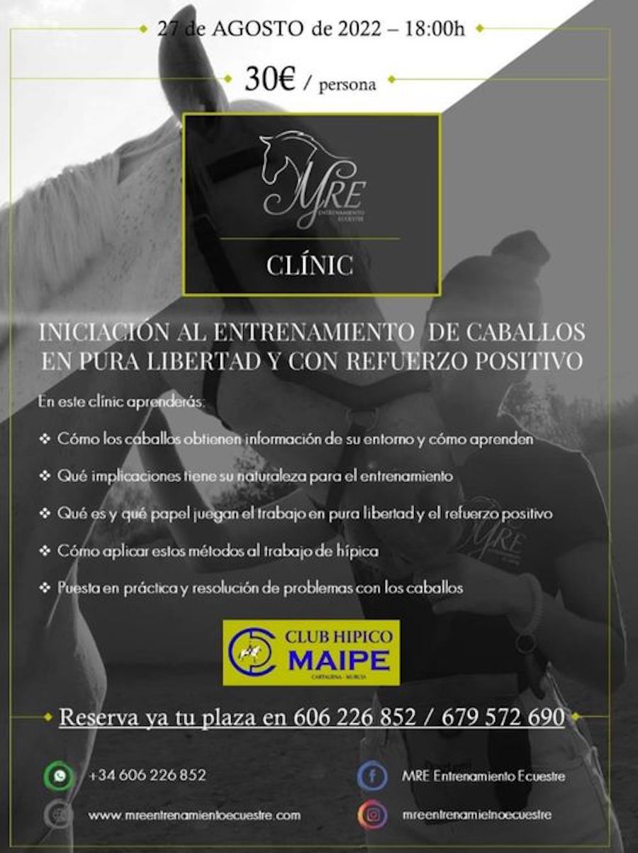’Curso de iniciación al entrenamiento de caballos en pura libertad y con refuerzo positivo’ es el título de la jornada técnica que se celebrará el 27 de agosto, a partir de las 18 horas, en las instalaciones ubicadas próximas a la salida de la autovía por la carretera La Palma-Los Barreros. Pinchar AQUÍ para ver el vídeo promocional