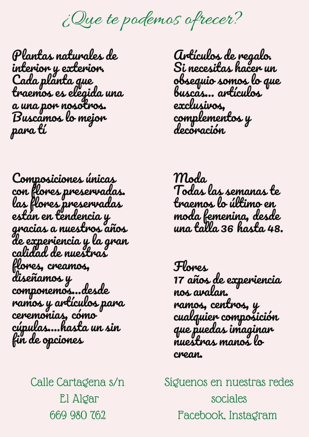 El establecimiento abierto hace unas semanas en la calle Cartagena de El Algar tiene plantas naturales de interior y exterior, artículos de regalo, flores (con el aval de 17 años de experiencia en el sector), composiciones únicas florales y moda (de la talla 36 a la 48 con las últimas tendencias femeninas). ¿Quieres saber más? Visítanos o llama al 669 980 762.