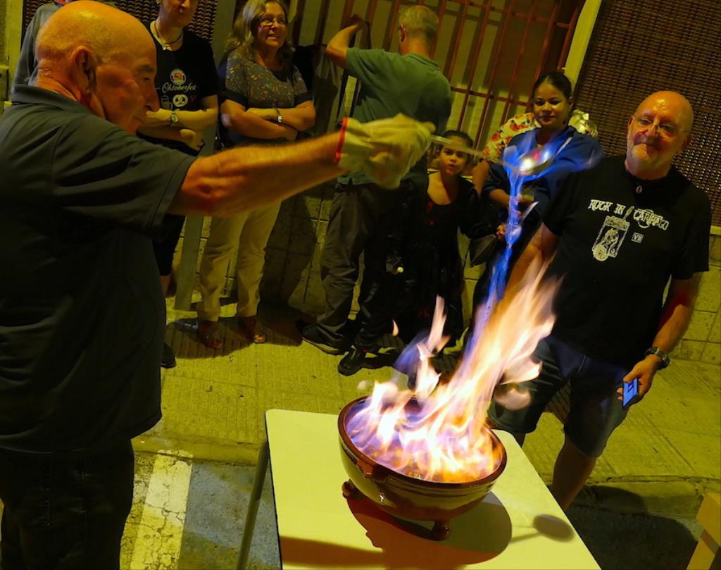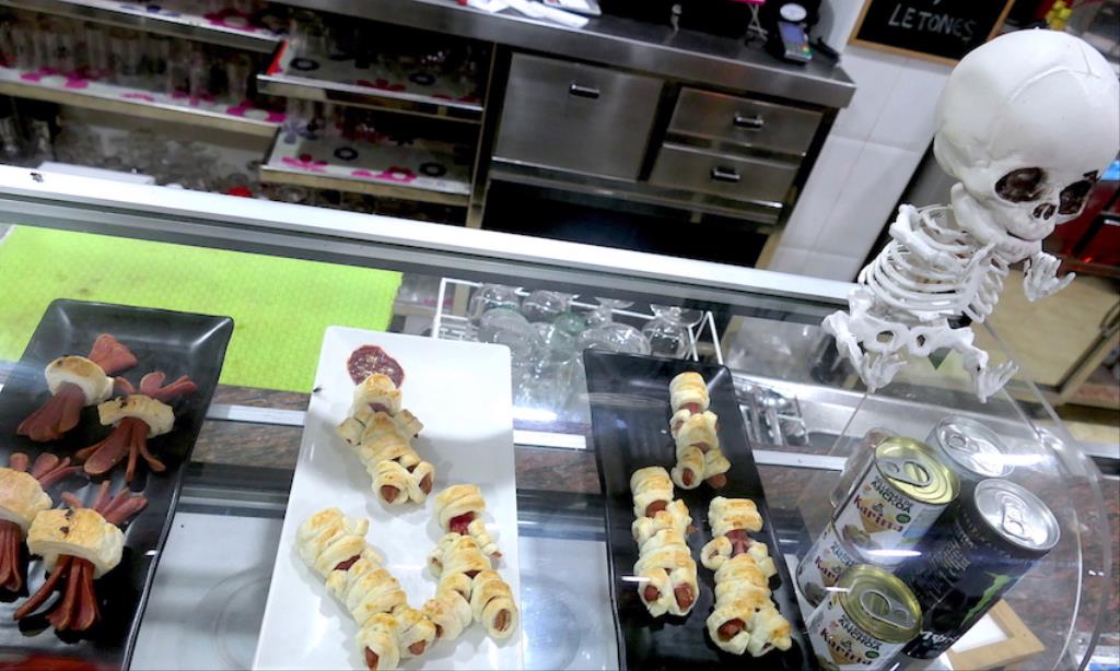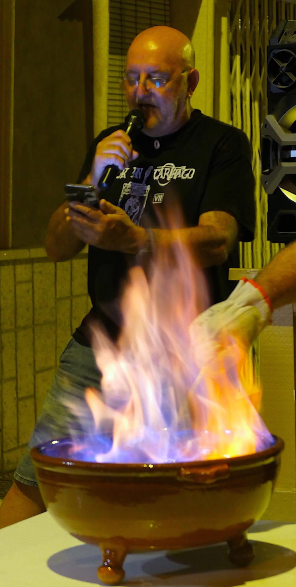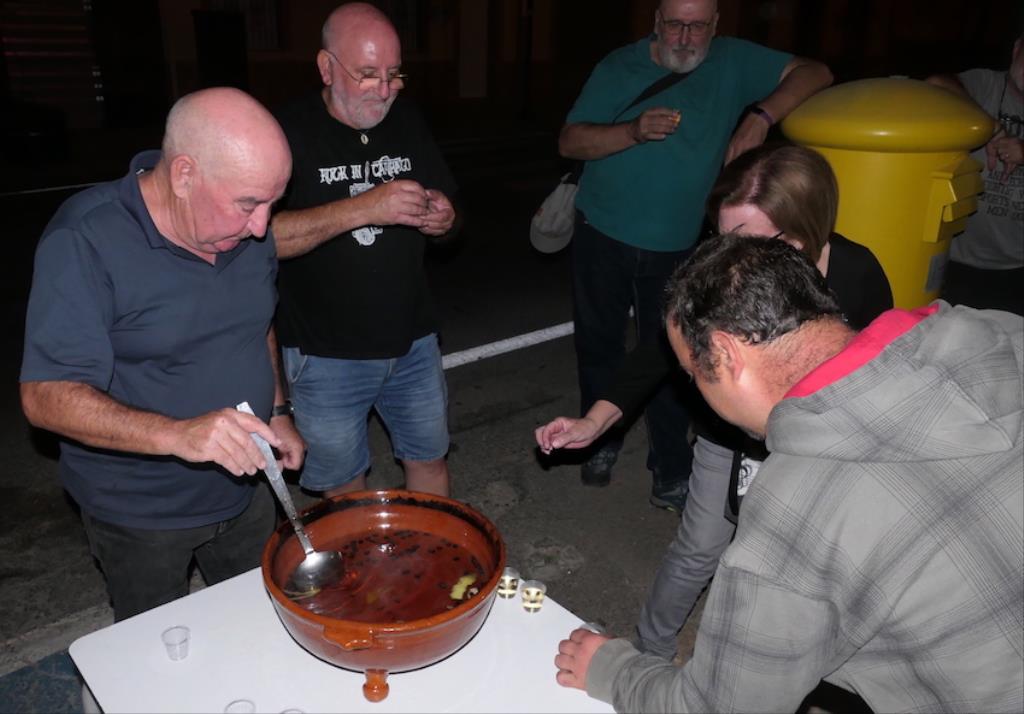 Del 29 al 31 de octubre, los clientes de Tapería-Restaurante-Bar ‘Casa de la Cultura’ de Molinos Marfagones ha ofrecido a sus clientes ‘dedos’, ‘momias’ y otros territóricos manjares gastronómicos, acompañados de buena cerveza al mejor precio. Además, instaló un photo-call en la entrada con dos lápidas de enterramiento. La respuesta de clientes, amigos y vecinos ha sido muy buena, pero faltaba ‘la guinda’, que la puso anoche la elaboración de una queimada (de 6 litros de orujo blanco) a cargo de José Luis al estilo ‘baalhamonero’, siendo José Vicente, su compañero de tropa en las fiestas de Carthagineses y Romanos, quien dio lectura al ‘conxuro’. Gustó, como refleja que todos los presentes repitieran.
