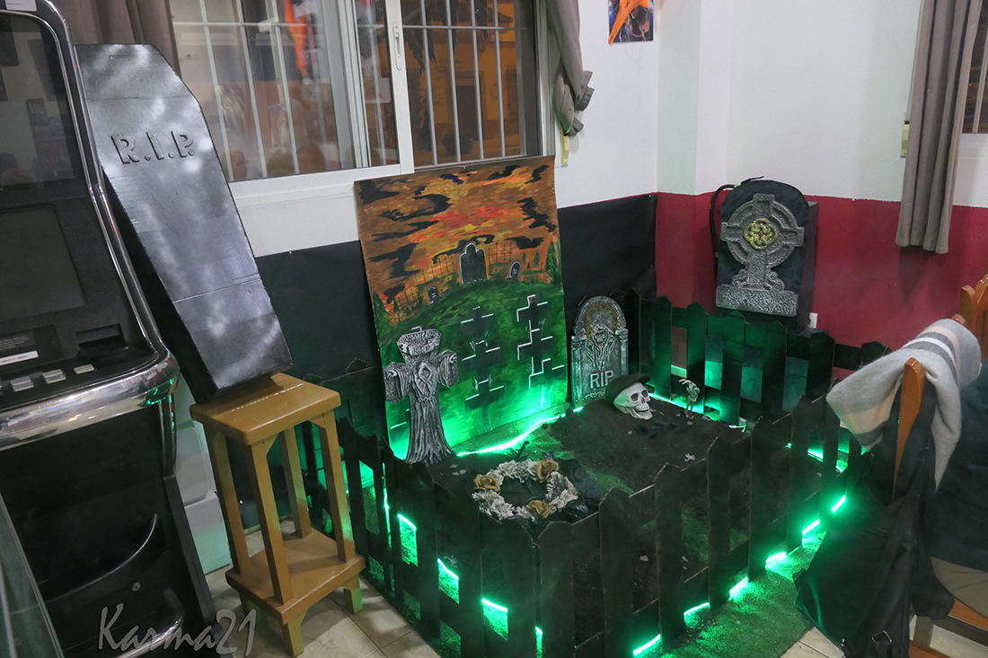 Cafetería-Tapería Casa de la Cultura sufrió una gran transformación en 'Halloween' con una muy trabajada y brillante decoración, con siniestros muñecos que se movían o iluminaba sus ojos entre las telarañas, además de envolver el humo el local en diversos momentos, especialmente cuando bajaba la iluminación. Además, surgió un cementerio dentro del establecimiento, no faltando más elementos similares en la terraza. Se cuidaron todos los detalles, hasta 'pinchos terroríficos'. El colofón fue la elaboración de una queimada.