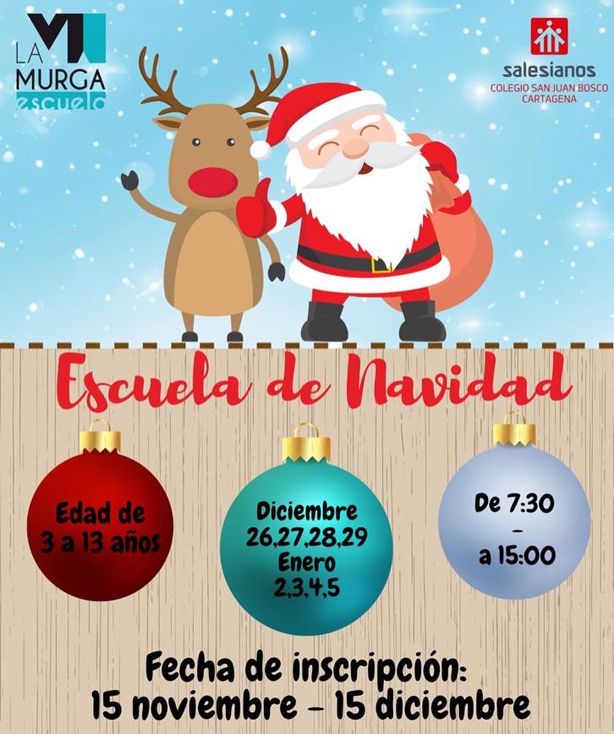 Organizado por el centro docente San Juan Bosco y La Muga, se llevará a cabo en las instalaciones de Barriada de Hispanoamerica-Los Dolores del 26 de diciembre al  5 de enero, de 7.30 a 15 horas, pudiéndose efectuar la inscripción el 15 de diciembre. Se pueden apuntar los niños, aunque no sean alumnos del colegio salesiano. Serán jornadas de diversión y juegos con muchas actividades para pasarlo en grande.