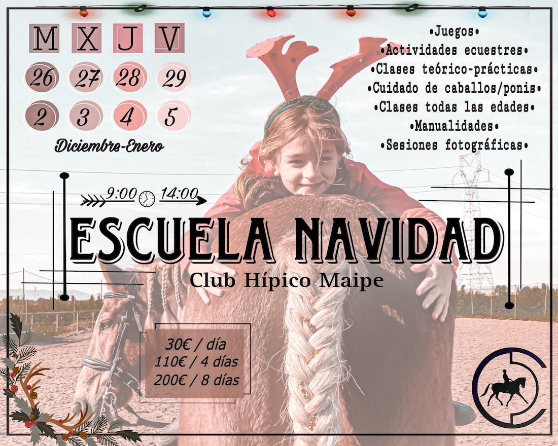 El club hípico organiza, un año más, su escuela navideña para los días 26, 27, 28 y 29 de diciembre y 2, 3, 4 y 5 de enero con juegos, actividades ecuestres clases teóricas y prácticas, cuidado de caballos y ponis, manualidades, sesiones fotográficas, etc. Puedes apuntar por días o por bloques de 4 u 8 días. Reserva tu plaza en el teléfono 679 57 26 90.