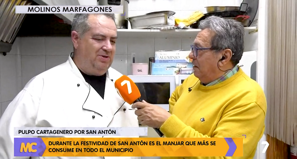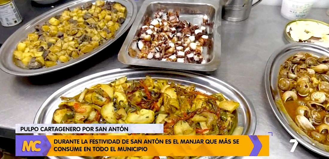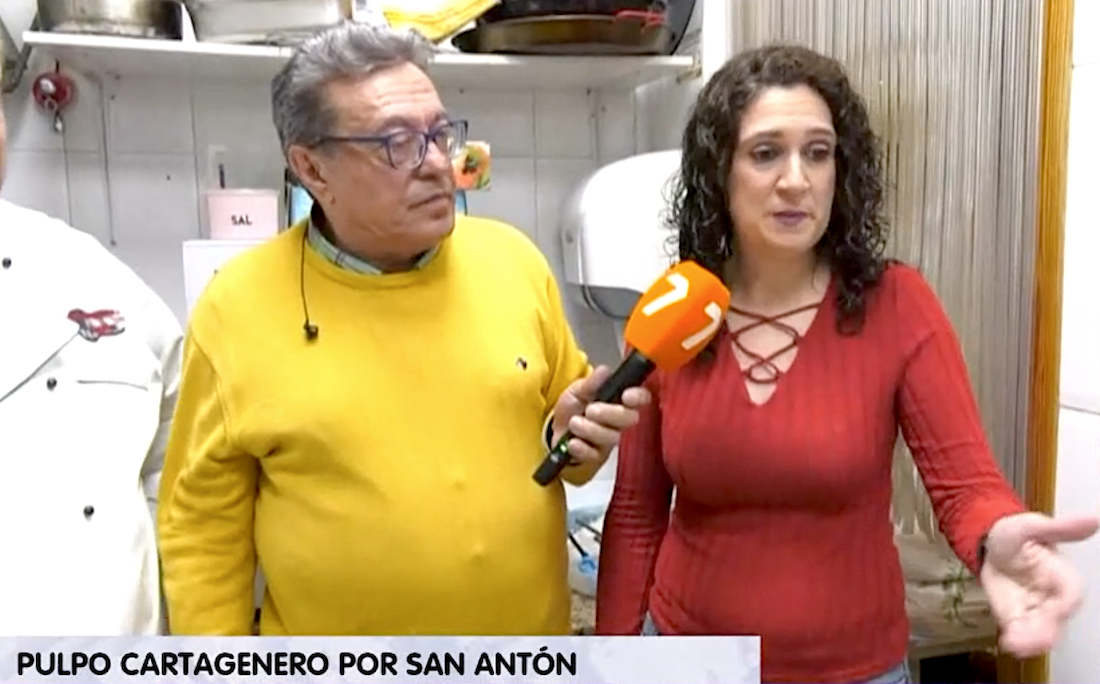 La tapería de la avenida principal del pueblo cartagenero fue objeto de una conexión en directo de casi diez minutos del programa 'Murcia Conecta' de la televisión autonómica 7tv RM, que dio a conocer sus manjares y especialmente el pulpo elaborado al estilo sanantonero o a la cartagenera, del que elaboró 20 kilos el pasado fin de semana en unas jornadas que continuarán del próximo sábado hasta el martes.