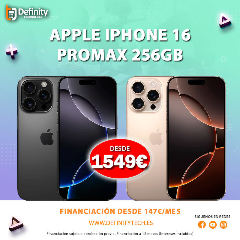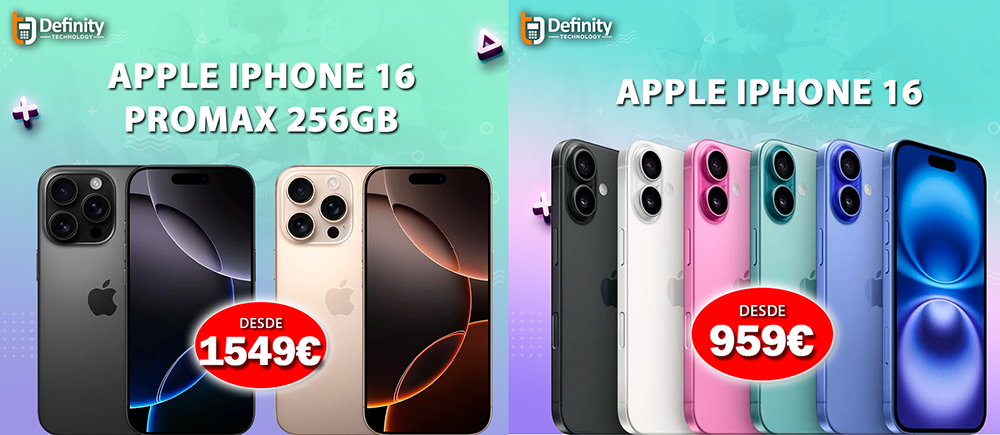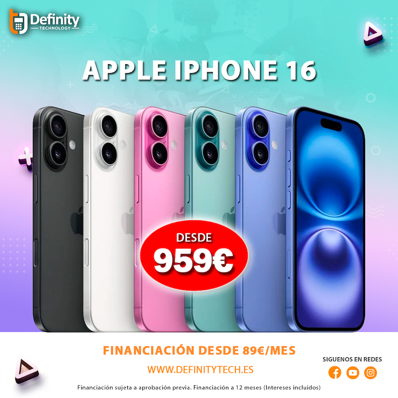 Dos móviles 'Apple Iphone 16' al mejor precio sólo durante esta semana. Uno lo puedes tener por 959 euros y el otro, modelo 'Promax 256GB', por 1.549 euros. No los encontrarás más baratos. Puedes adquirirlos a través de la tienda física de la calle Mayor de La Unión o en internet a gravés de www.definitytech.es
