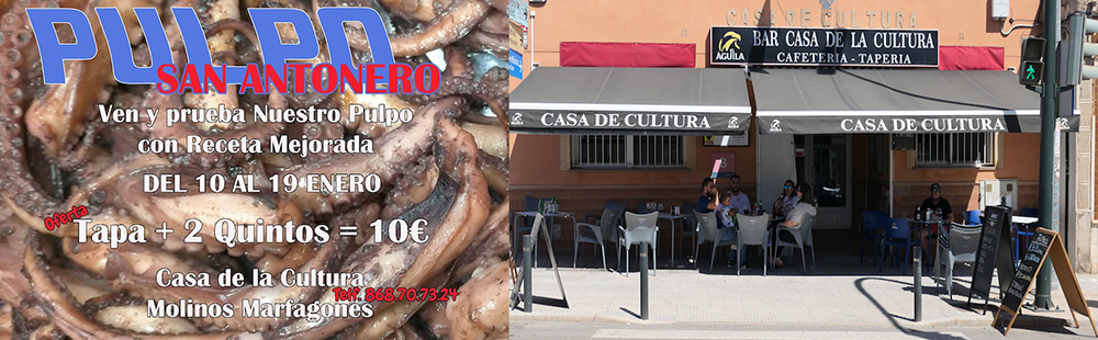 El bar-tapería Casa de la Cultura de la localidad molinera de Cartagena ofrece desde hoy y hasta el domingo 19 de este mes el tradicional manjar de San Antón con receta mejorada. Además, hay una oferta estupenda para saborearlo, pues por 10 euros tienes tapa y 2 quintos. Más información en el teléfono 868 707 324