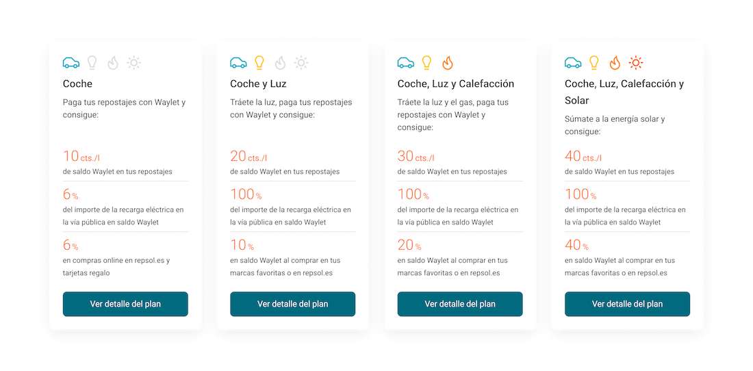 • Plan Coche y Luz: si además de repostar tiene contratada una tarifa de luz, el cliente acumula un saldo de 20 céntimos de euro por litro en carburante y el 100% del importe de las recargas realizadas en cualquiera de los puntos públicos de Repsol.