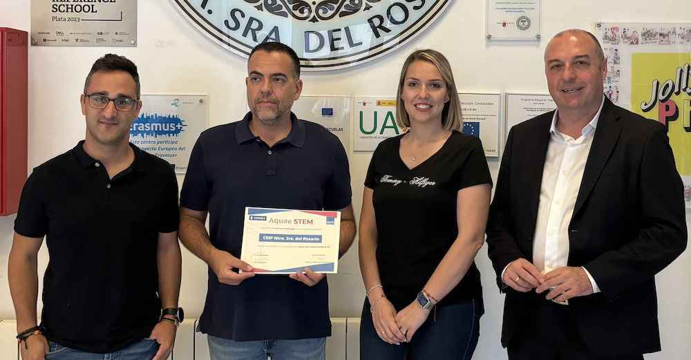 Uno de esos reconocimientos ha sido para el CEIP Ntra. Sra. del Rosario de Torre Pacheco, por ser el centro más comprometido. Se reconoce así al colegio que ha realizado más unidades didácticas, ya que las 39 alumnas que participan en el programa han realizado todas las actividades, ampliando y consolidando los conceptos trabajados. Andrés Martínez, gerente de zona de Hidrogea, junto a la concejala Asunción Pedreño, hicieron entrega del diploma de reconocimiento a Juan Carlos Buide, profesor del colegio y a las alumnas Andrea Segura de 5°C y María Lamsiah Celdrán de 5°B.