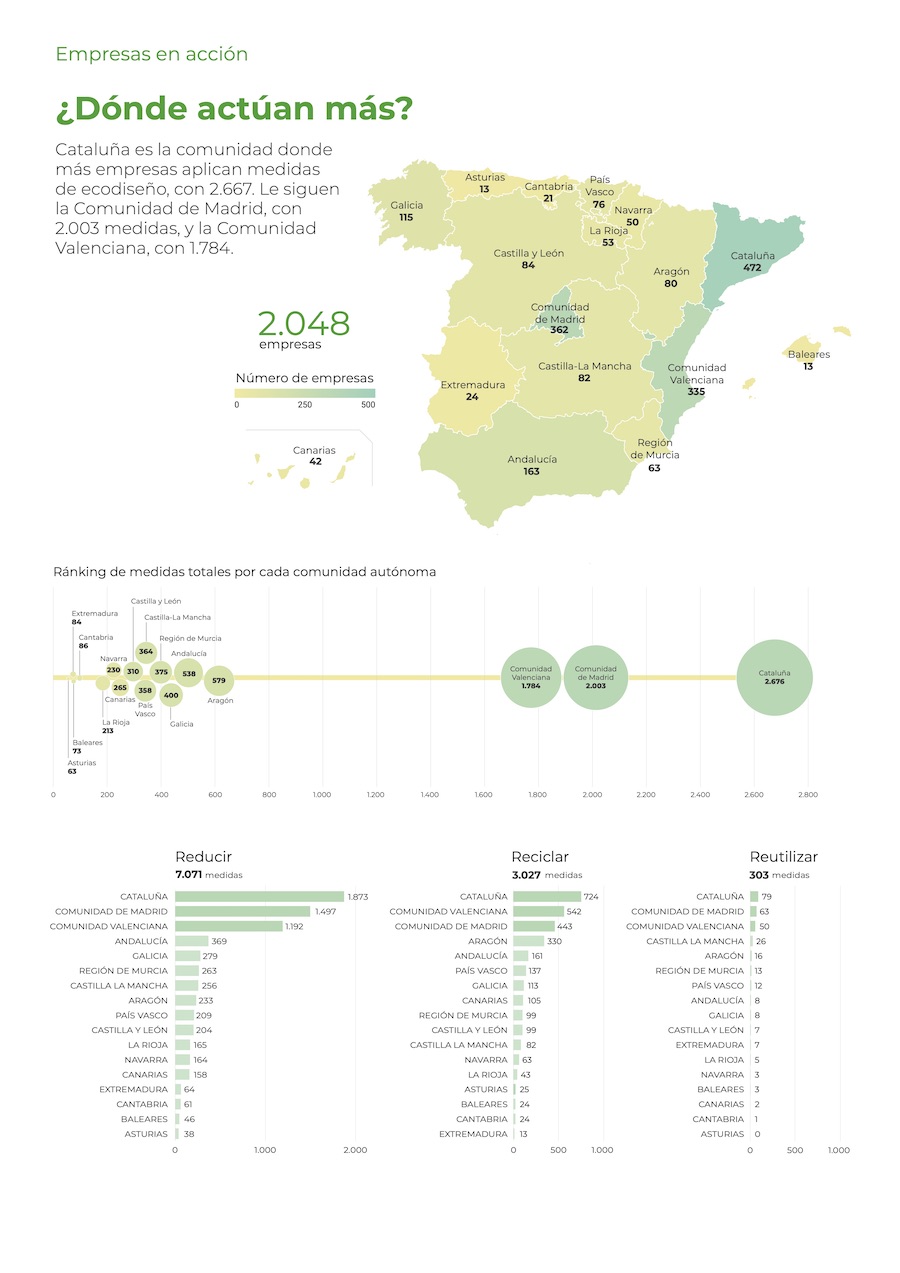 Por tipo de empresas, el 40% de las que han aplicado medidas de ecodiseño son pymes, lo que demuestra sus esfuerzos por, además de cumplir con la normativa, estar más cerca de las peticiones y demandas de los consumidores. Por sectores, el de la alimentación es el que más medidas ha activado: un total de 215 entre 2021 y 2023. Le sigue el sector del cuidado personal y del hogar, con un total de 124 medidas.